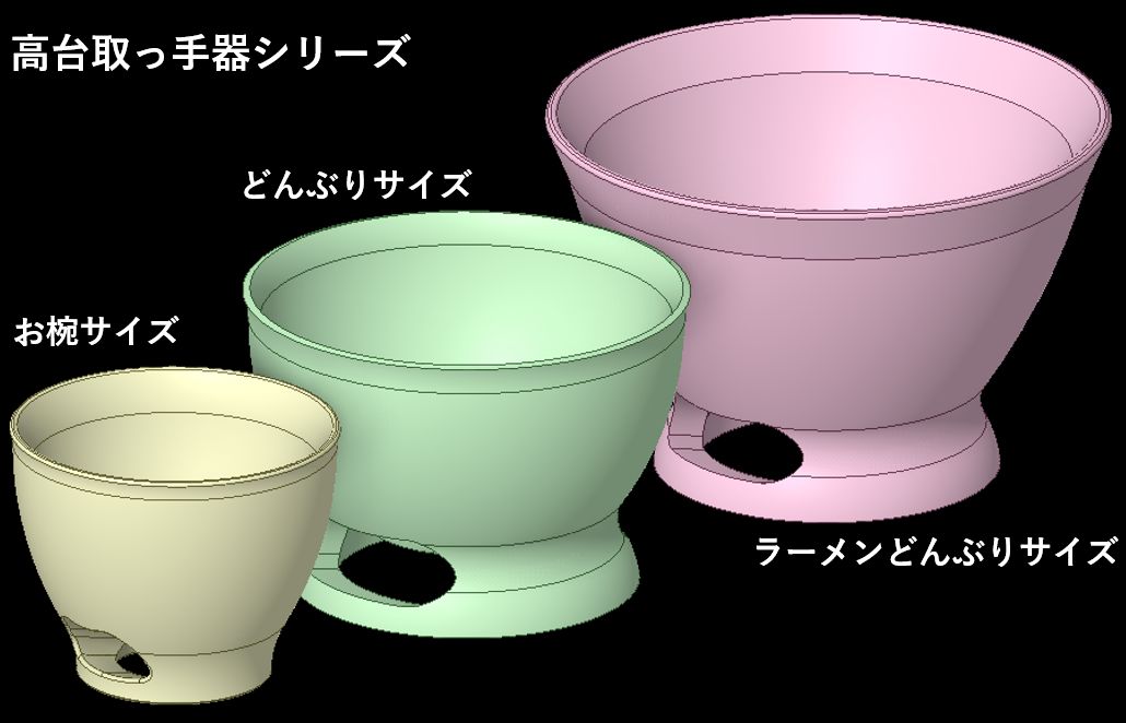 大きなどんぶりのような器の方が 両手でないと持ち上げにくいし アツアツのうどんやラーメンなどを食べる機会も多いので、そういった器に 高台取っ手が向いていると考え、開発を進めていきます