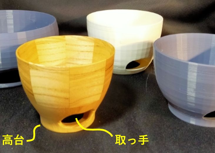 木製の器は 「割れにくい」「熱くなりにくい」「軽い」「冷めにくい」 など、圧倒的に陶器の器より優れた特徴があるので、高台取っ手 の「持ち上げ易い」 特徴を含め アピールしていきたい